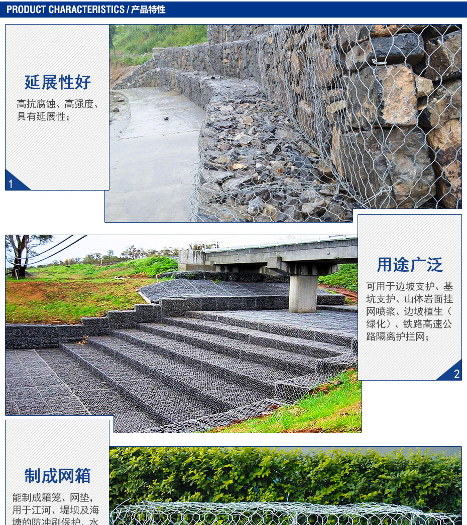 石籠網(wǎng)可用于邊坡支護、基坑支護、山體巖面掛網(wǎng)噴漿、邊坡植生(綠化)、鐵路高速公路隔離護攔網(wǎng),它還能制成箱籠、網(wǎng)墊,用于江河、堤壩及海塘的防沖刷保護,水庫、河流截流用網(wǎng)箱。