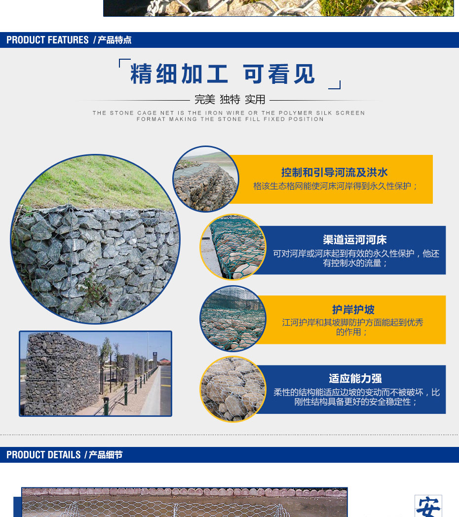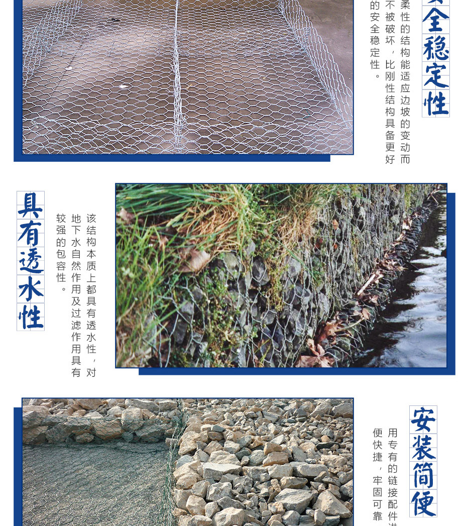 石籠網(wǎng)由高不腐蝕、強度高、具有延展性的低碳鋼絲或者包覆PVC的以上鋼絲使用機械編織而成,使用該網(wǎng)制作而成的箱型結(jié)構(gòu)就是石籠網(wǎng)箱。根據(jù)ASTM和EN標(biāo)準(zhǔn),所使用的低碳鋼絲直徑根據(jù)工程設(shè)計要求而不同。一般介于2.0-4.0mm之間,石籠網(wǎng)鋼絲的抗拉強度不少于38kg/m2,金屬鍍層重量一般高于245g/m2,石籠網(wǎng)片的邊緣線直徑一般要大于網(wǎng)線直徑。其雙線絞合部分的長度不得小于50mm.以保證絞合部分鋼絲的金屬鍍層和PVC鍍層不受破壞。